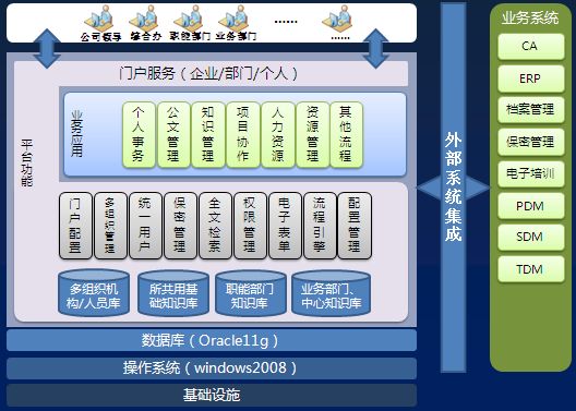 提供整套企业门户、协同办公、人力资源、知识管理、项目管理和财务管理功能。